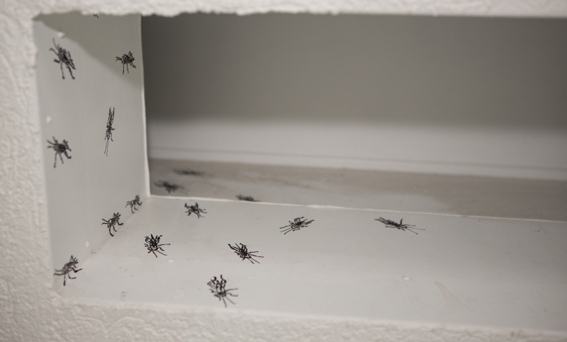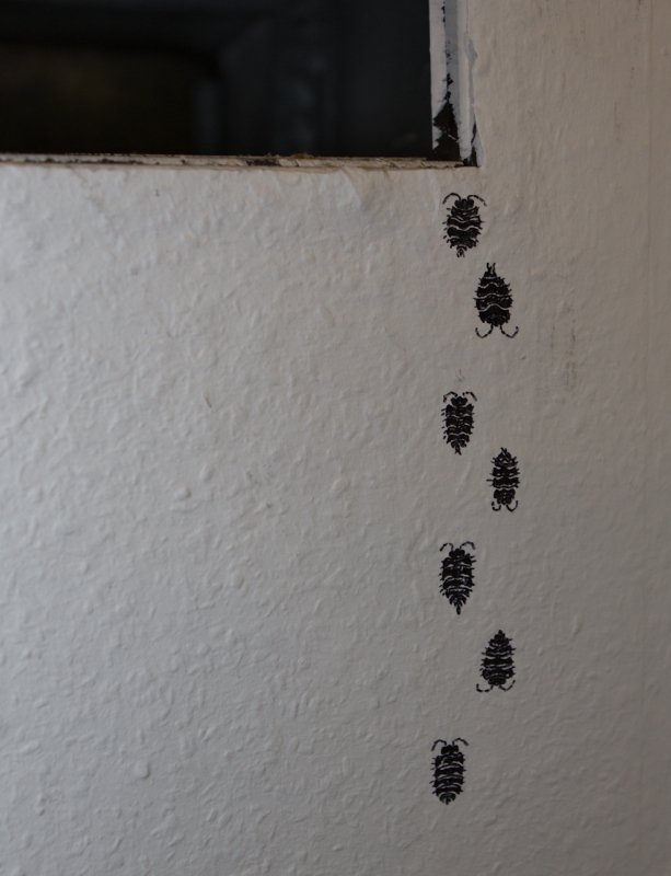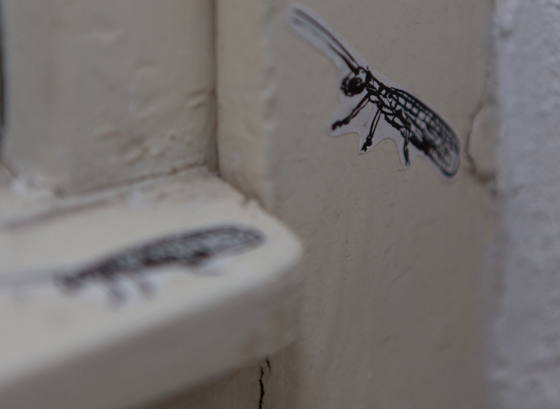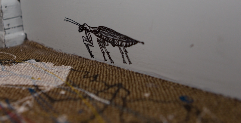 “Ein Klangteppich aus Zikaden-Zirpen wabert durch die Räume und weist auf eine eigens für »Rausgeflogen« von Herget angefertigte »installative Zeichnung« hin. Ihre Arbeit unter dem Titel »Insektenversetzung« ist eine Art Insekten-