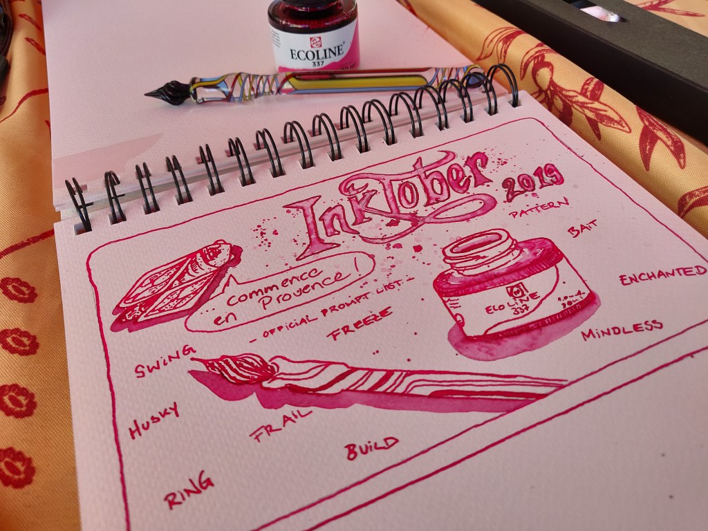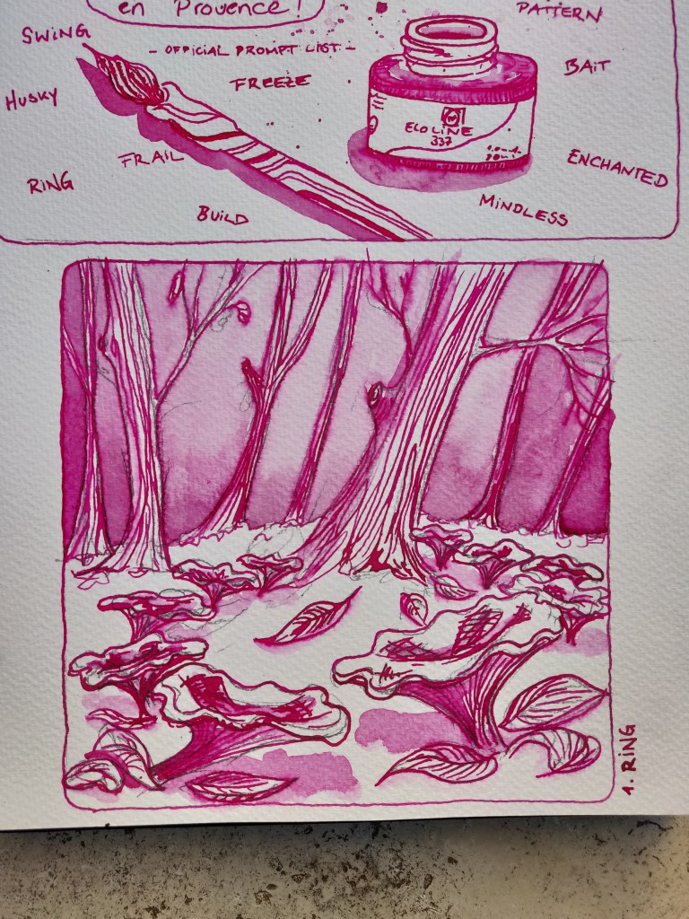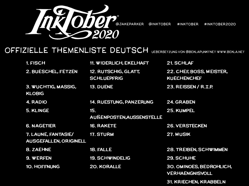 Was der Inktober noch mit sich bringt: Für mich nimmt am Inktober nur teil, wer sich an die offizielle promptlist hält. Klar ist das auch eine nette persönliche Challenge, sich andere Themen(listen) zu suchen, die immer mannigfaltig gepostet werden, aber das ist nicht “Inktober”. Ein besonderes Schmankerl des täglichen Zeichnens ist doch die Vernetzung, und abends oder am nächsten Tag in diversen sozialen Medien zu schauen, was ANDERE Kreative aus dem gleichen Thema gemacht haben! Immer wieder faszinierend, die völlig unterschiedlichen Werke, Ideen, Herangehensweisen und Umsetzungen, obwohl Thema und Medium vermeintlich gleich sind. DAS macht für mich den Inktober aus.